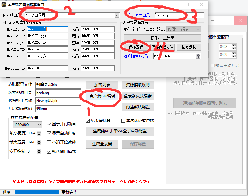 如图中所示,打开登录器配置器,点击客户端GUI编辑,检查2(传奇客户端路径)和3(自定义补丁文件夹名称)是否正确。