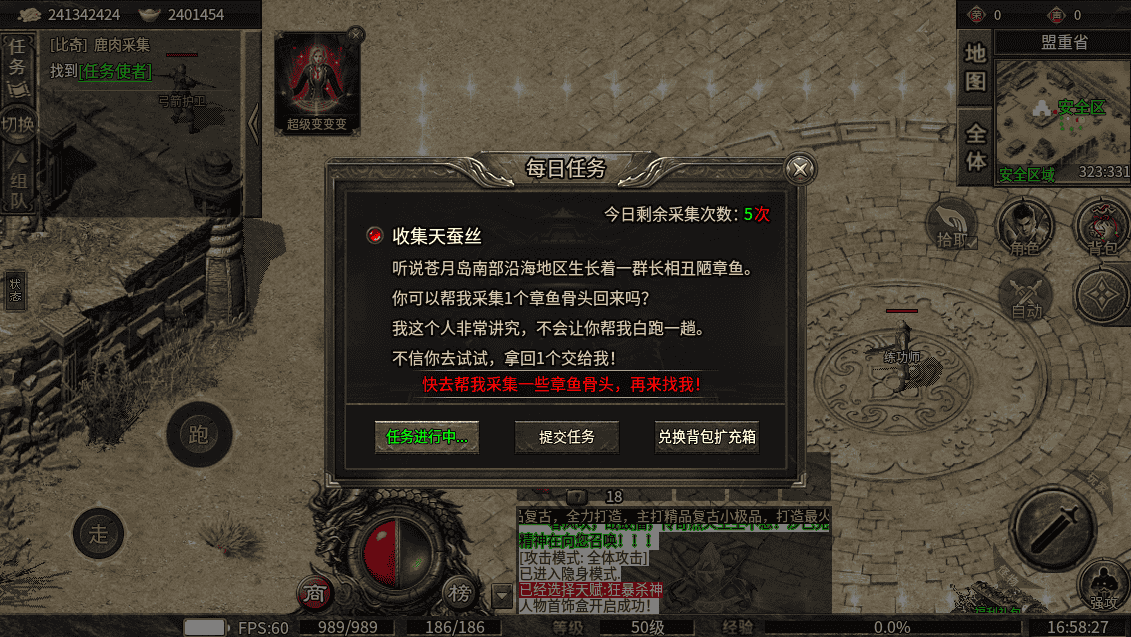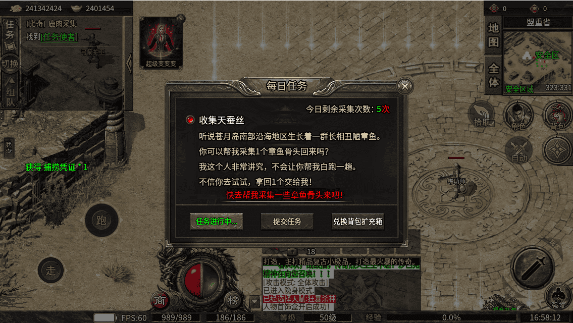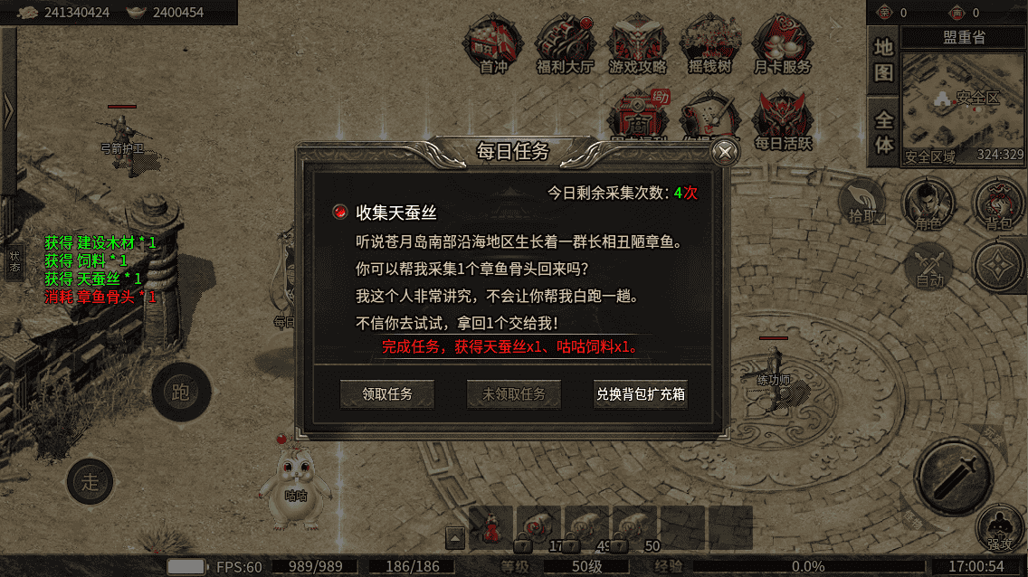 每天通过采集任务NPC可免费领取5次采集任务,任务流程为接取任务、前往采集、提交任务,通过完成任务获得指定的道具,该功能脚本可以有效的提升游戏的互动性和娱乐性,任务每天0点自动重置。