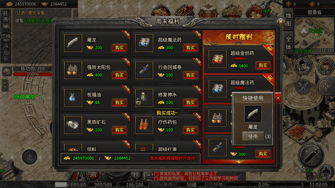 3、开放后,游戏顶部导航图标会出现福利商城入口,在QM脚本中修改坐标等信息;